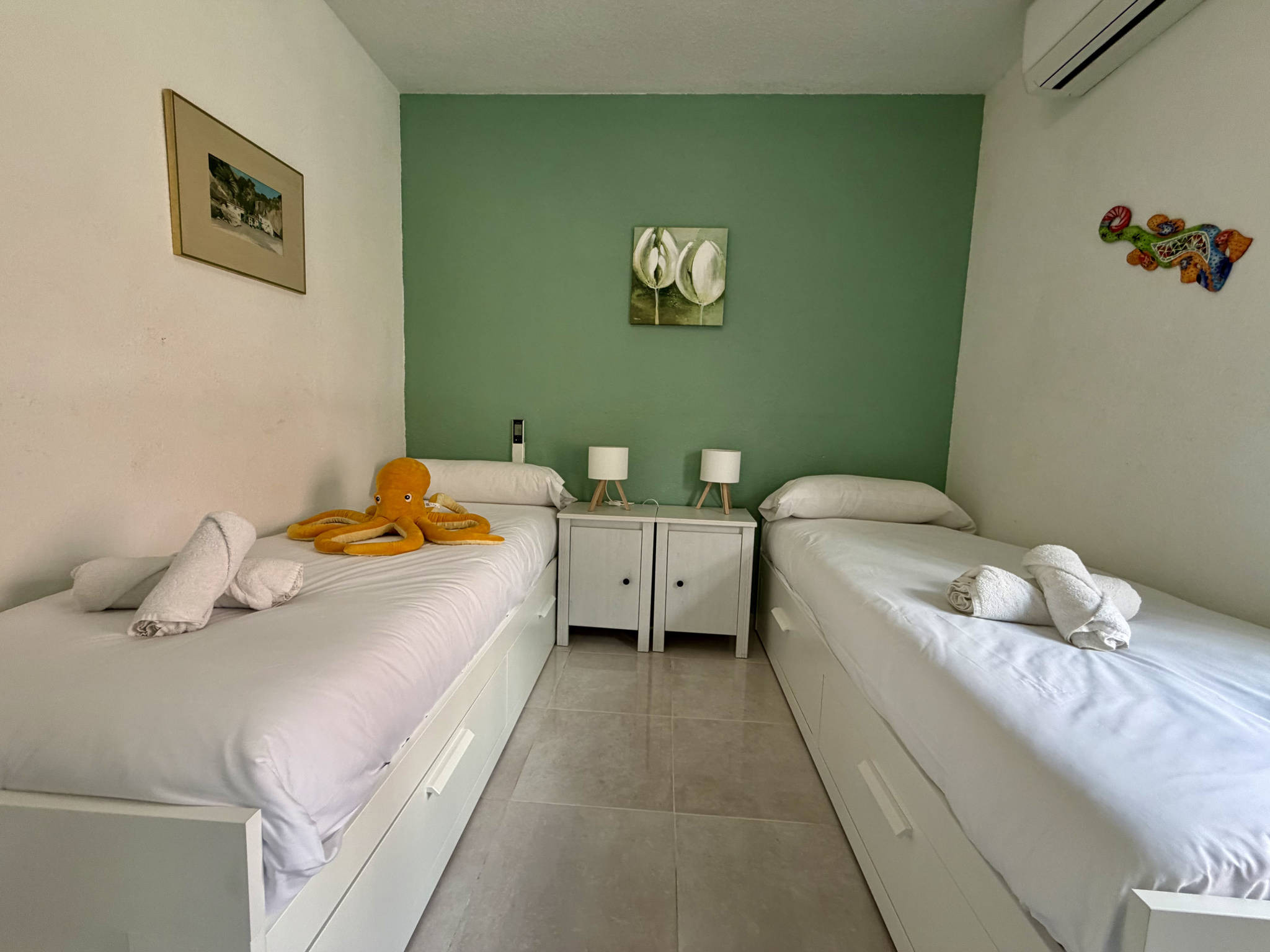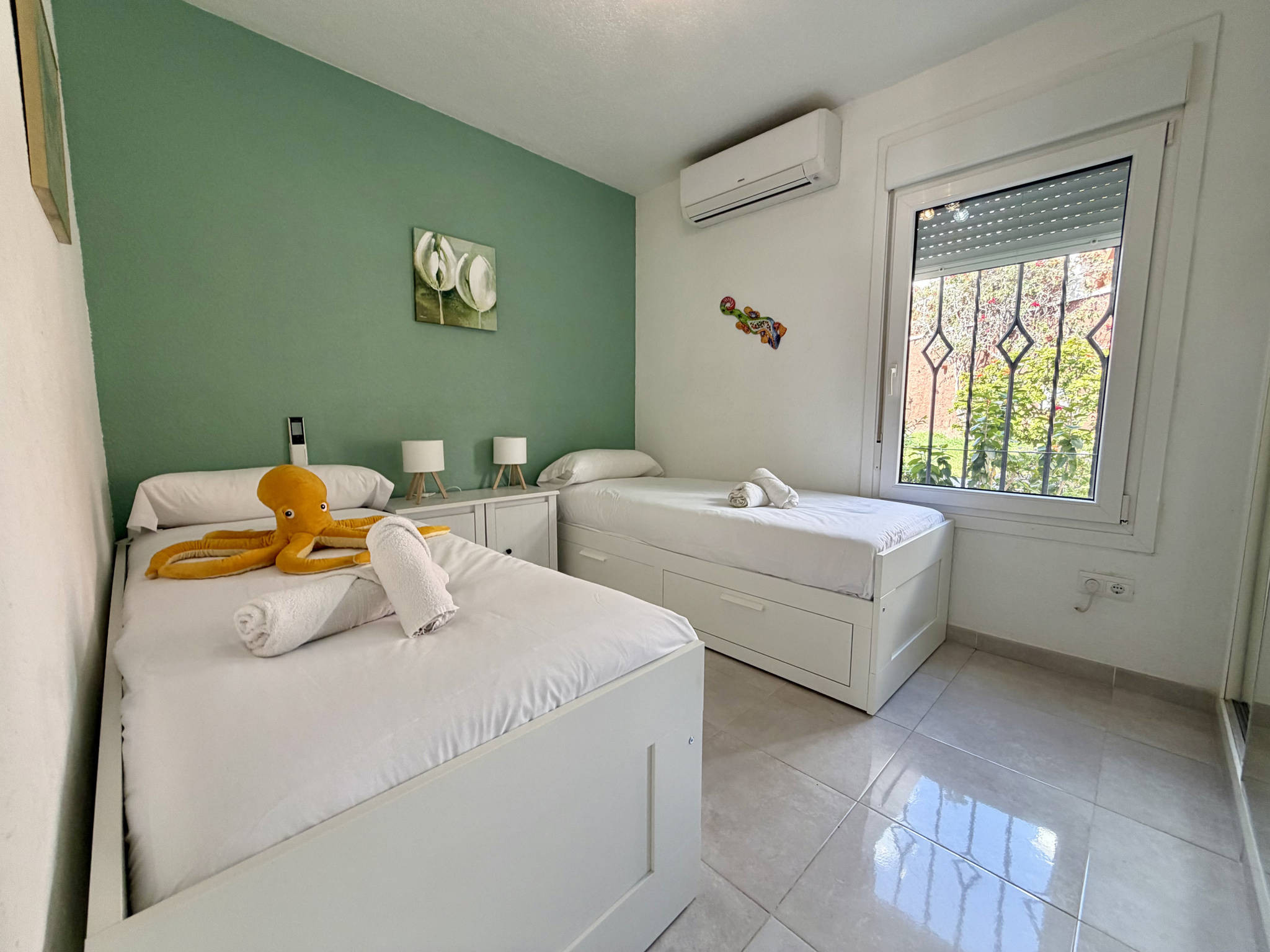 La zone de vie se distingue par son agencement pratique, où la cuisine intégrée dispose de son propre espace défini mais sans barrières, facilitant la communication dans la maison. Elle est entièrement équipée d'un lave-vaisselle pour que vous ne perdiez pas de temps en tâches ménagères. Le salon-salle à manger, avec Wi-Fi haut débit pour le télétravail et télévision, communique directement avec l'extérieur. Le logement dispose de deux chambres : une avec un lit double et une autre avec deux lits simples, ainsi qu'une salle de bain centrale avec douche.Double terrasse privée avec barbecue et ensoleillement permanent