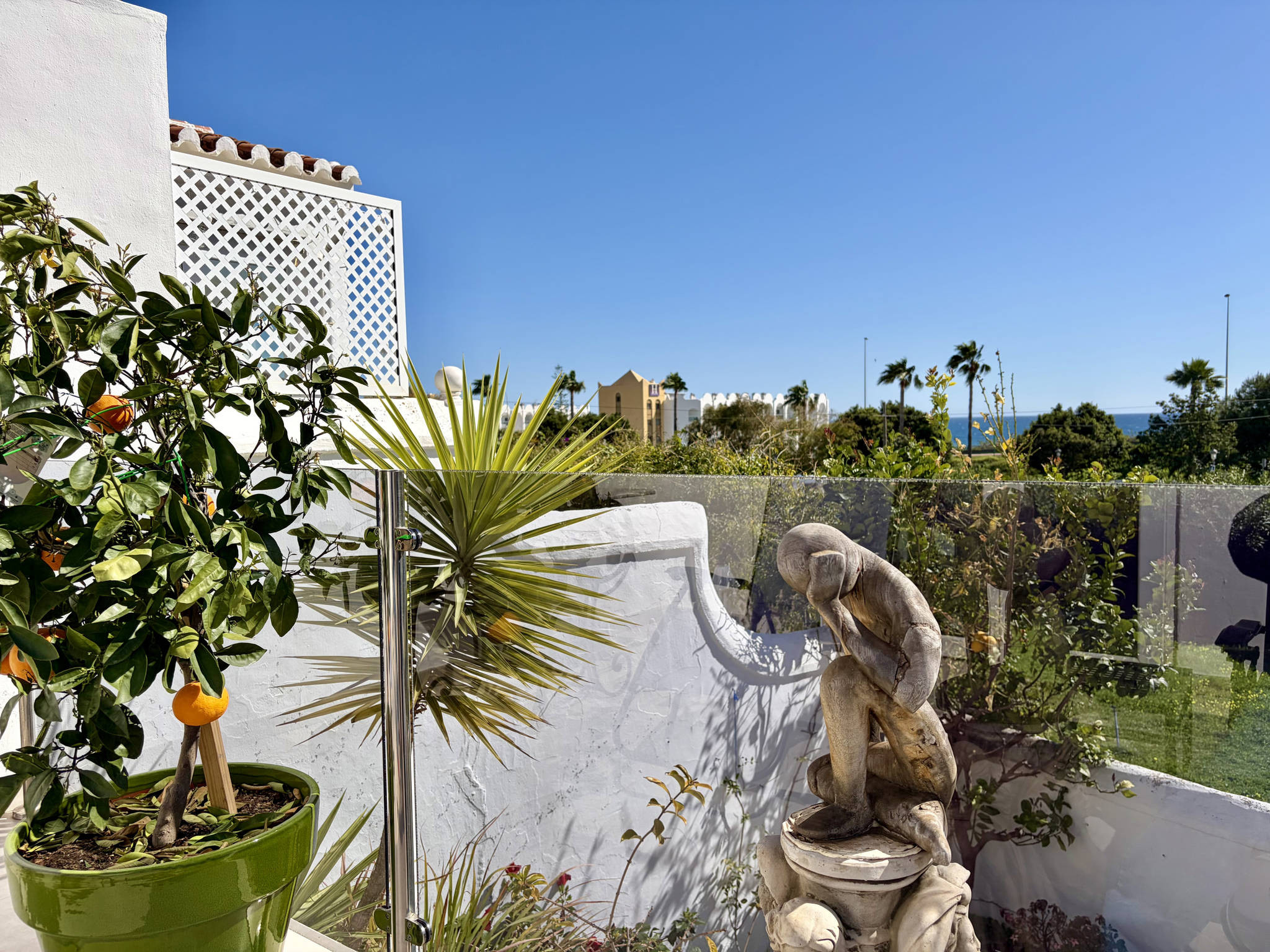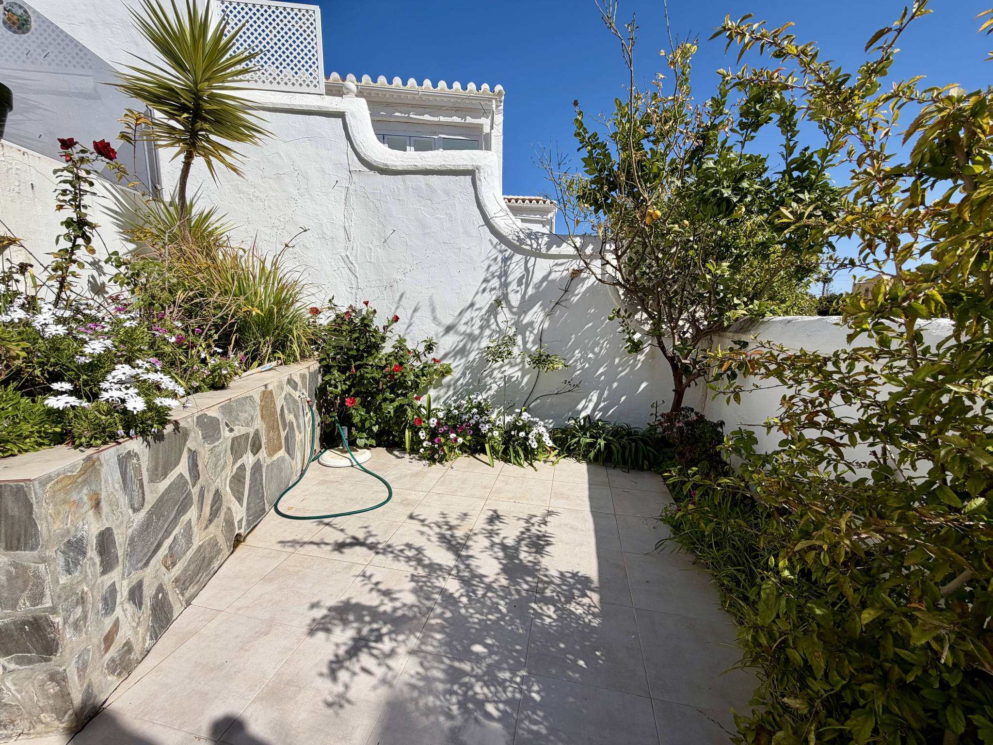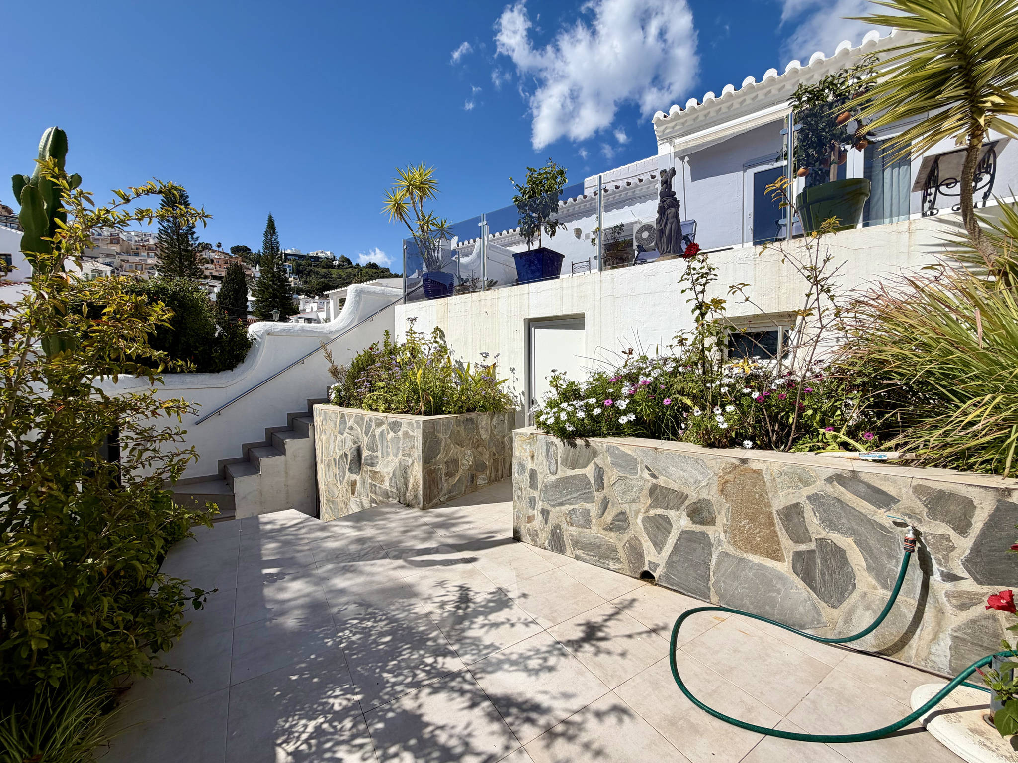 Le plus grand atout de cet appartement est son vaste espace extérieur, réparti sur plusieurs niveaux reliés par quelques marches pour plus de commodité. En sortant par la porte vitrée du salon, vous arrivez au niveau principal avec des chaises longues pour vous détendre avec vue sur la mer et, juste à droite dans ce même espace, un coin avec une grande table et un barbecue pour profiter de dîners en plein air. En descendant quelques marches, vous accédez à un deuxième niveau dégagé et entouré de fleurs, un coin idéal pour profiter du calme. Quelques marches plus bas se trouve le niveau inférieur, où se trouve une pièce indépendante avec la machine à laver et une entrée secondaire stratégique.Accès stratégique et services de l'urbanisation
