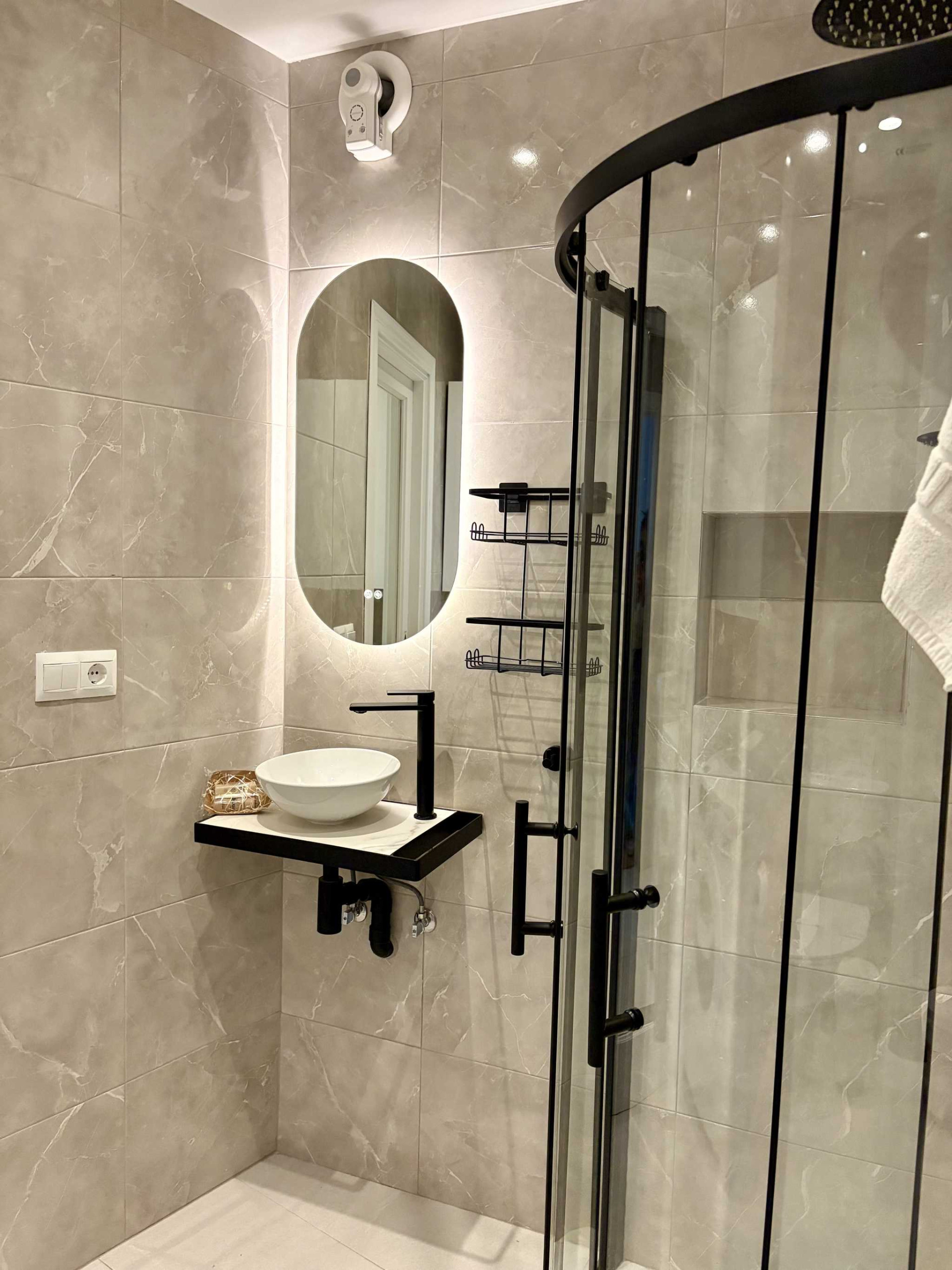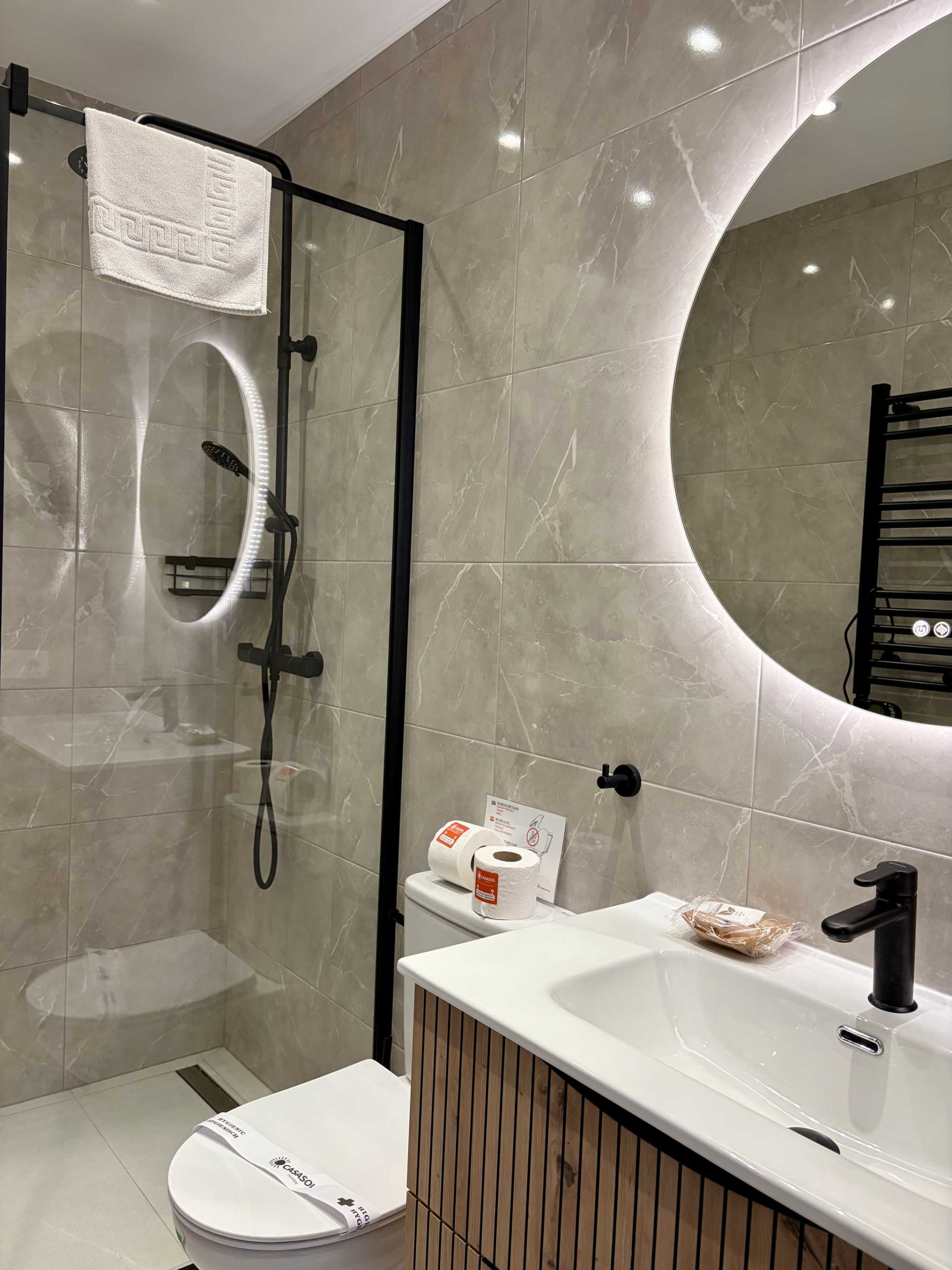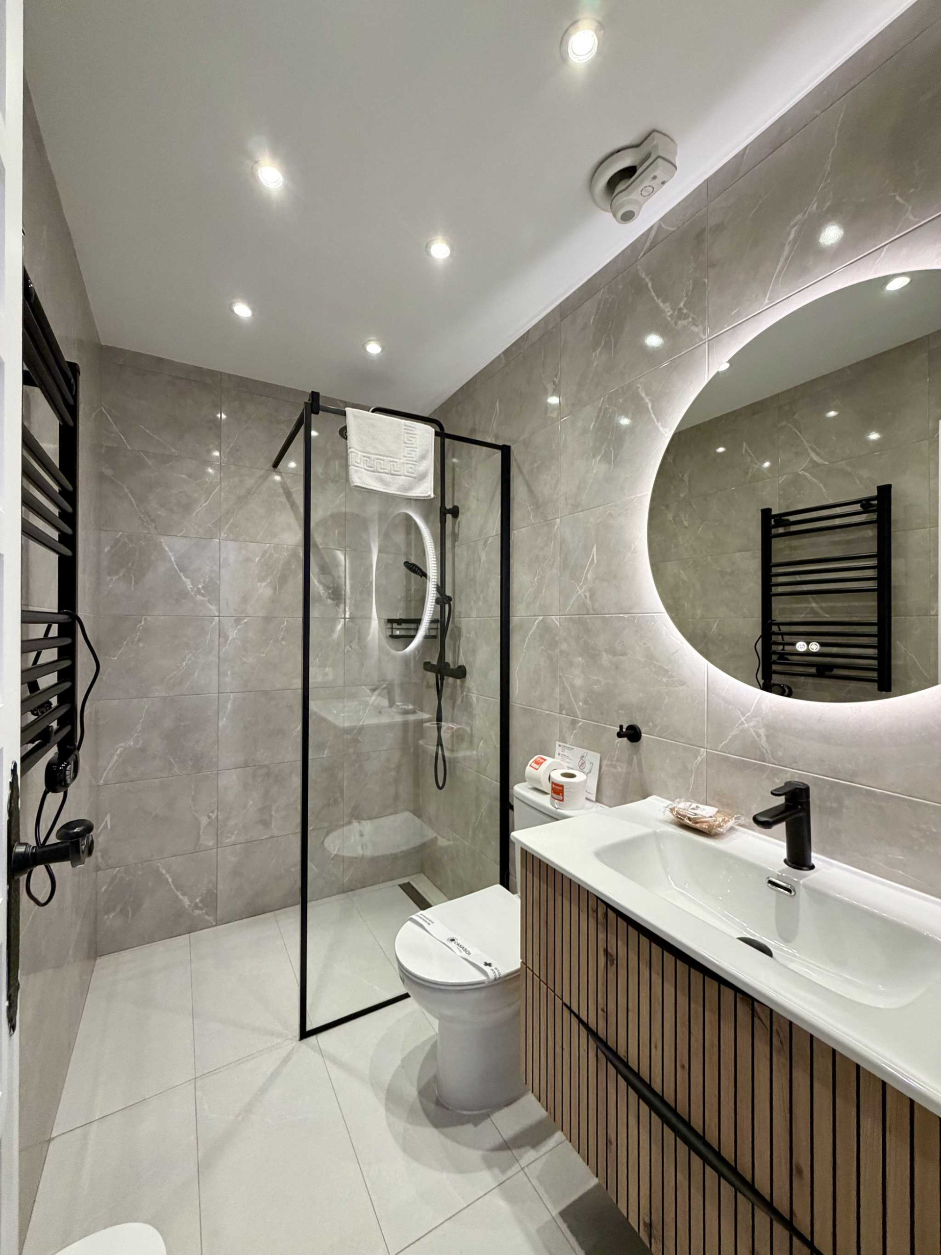 - Une deuxième salle de bains moderne accessible depuis le couloir avec douche, toilettes et finitions élégantes.