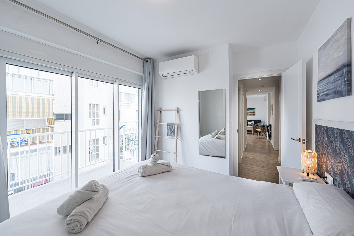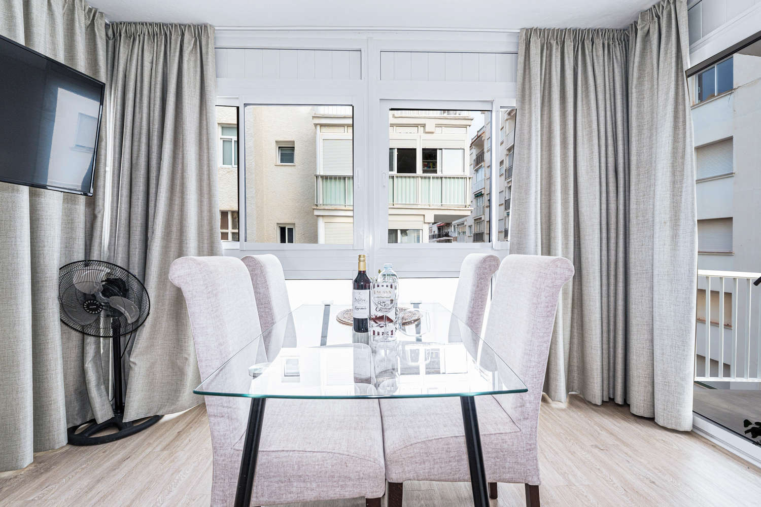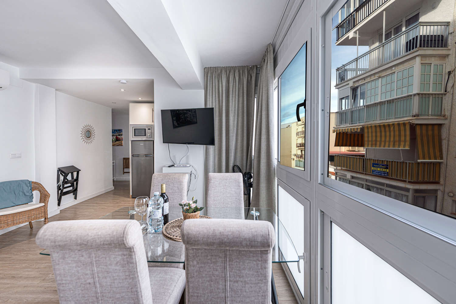 The apartment is in a lovely location with two balconies, close to the beach and restaurants.The apartment is very clean and modern with everything you need for a relaxing holiday, Nice to have a shopping trolley as we were stopping for a month,Alreaplus