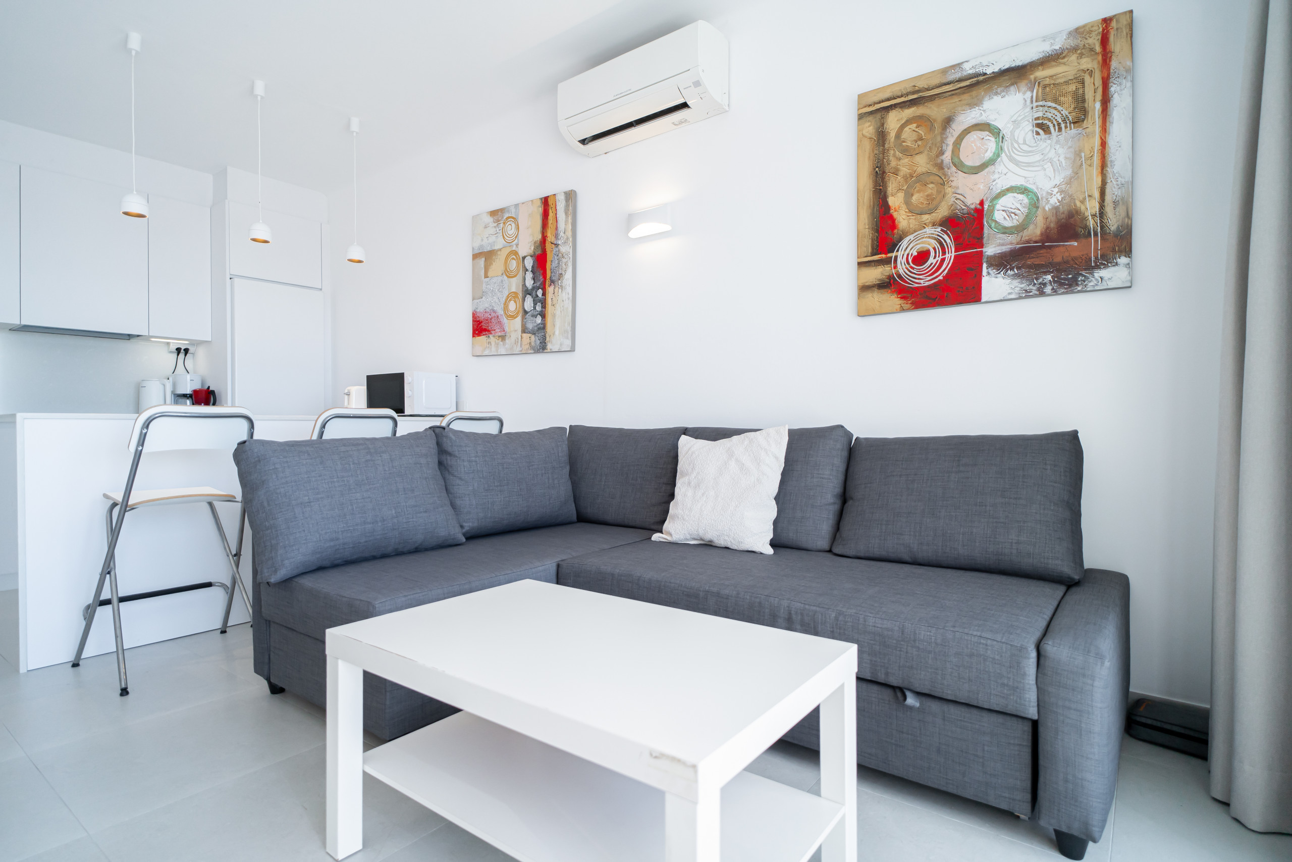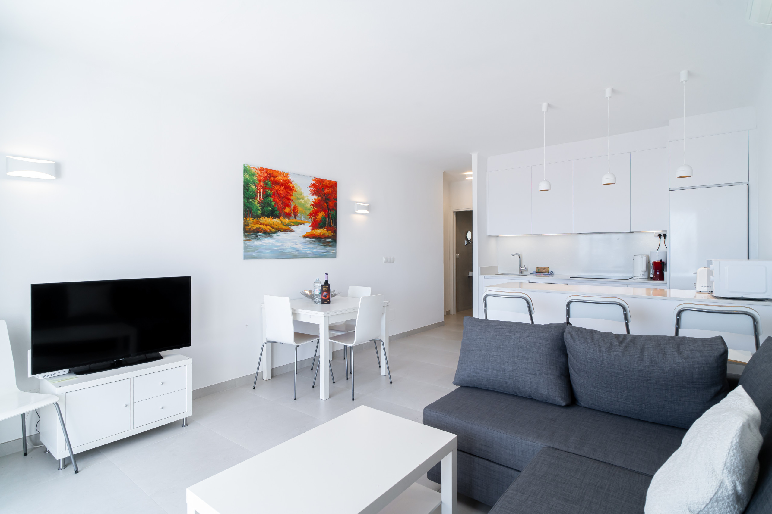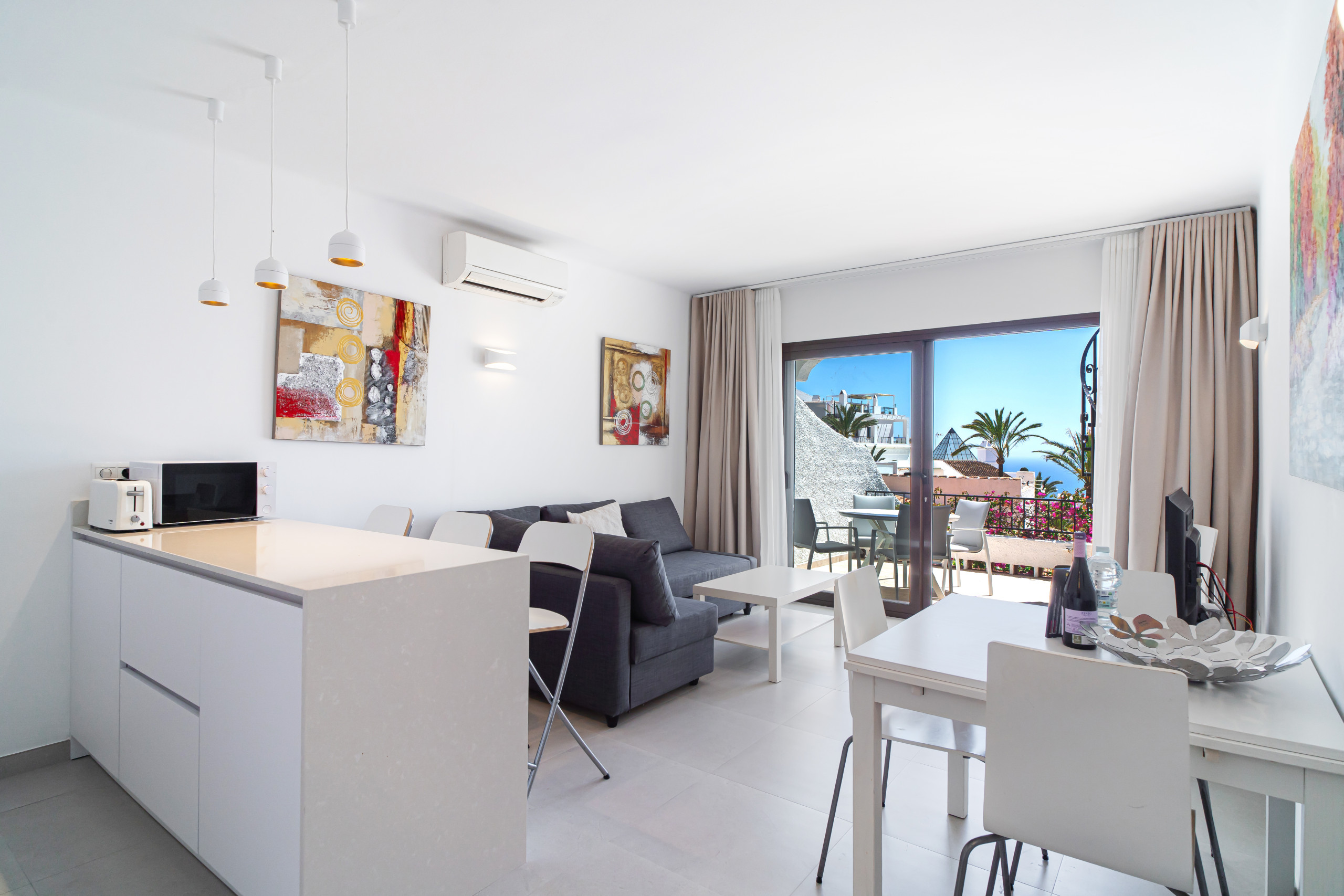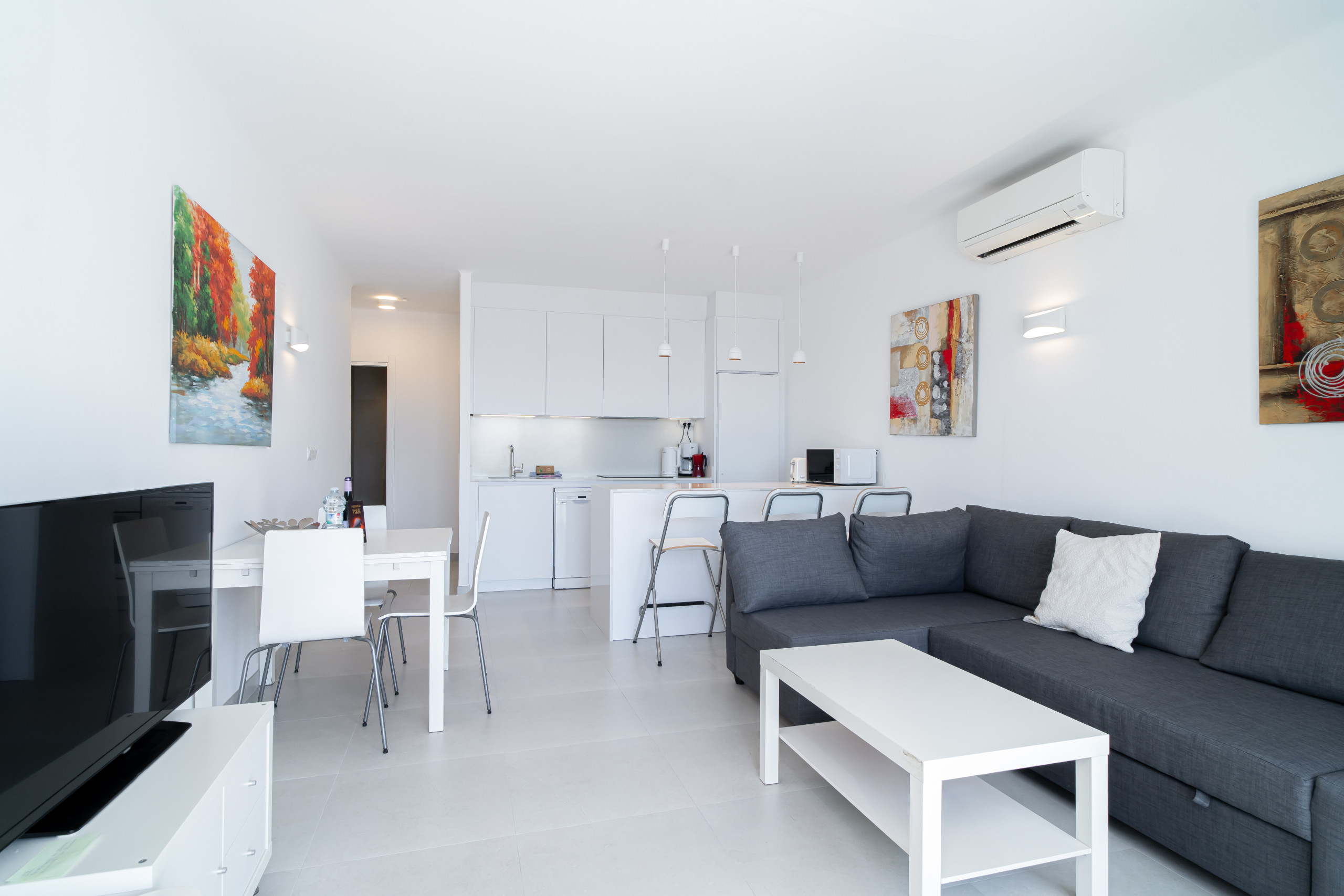 Le salon, baigné de lumière naturelle grâce à son exposition plein sud, est équipé de la climatisation, d'une télévision connectée avec chaînes internationales et d'une connexion Wi-Fi haut débit.
