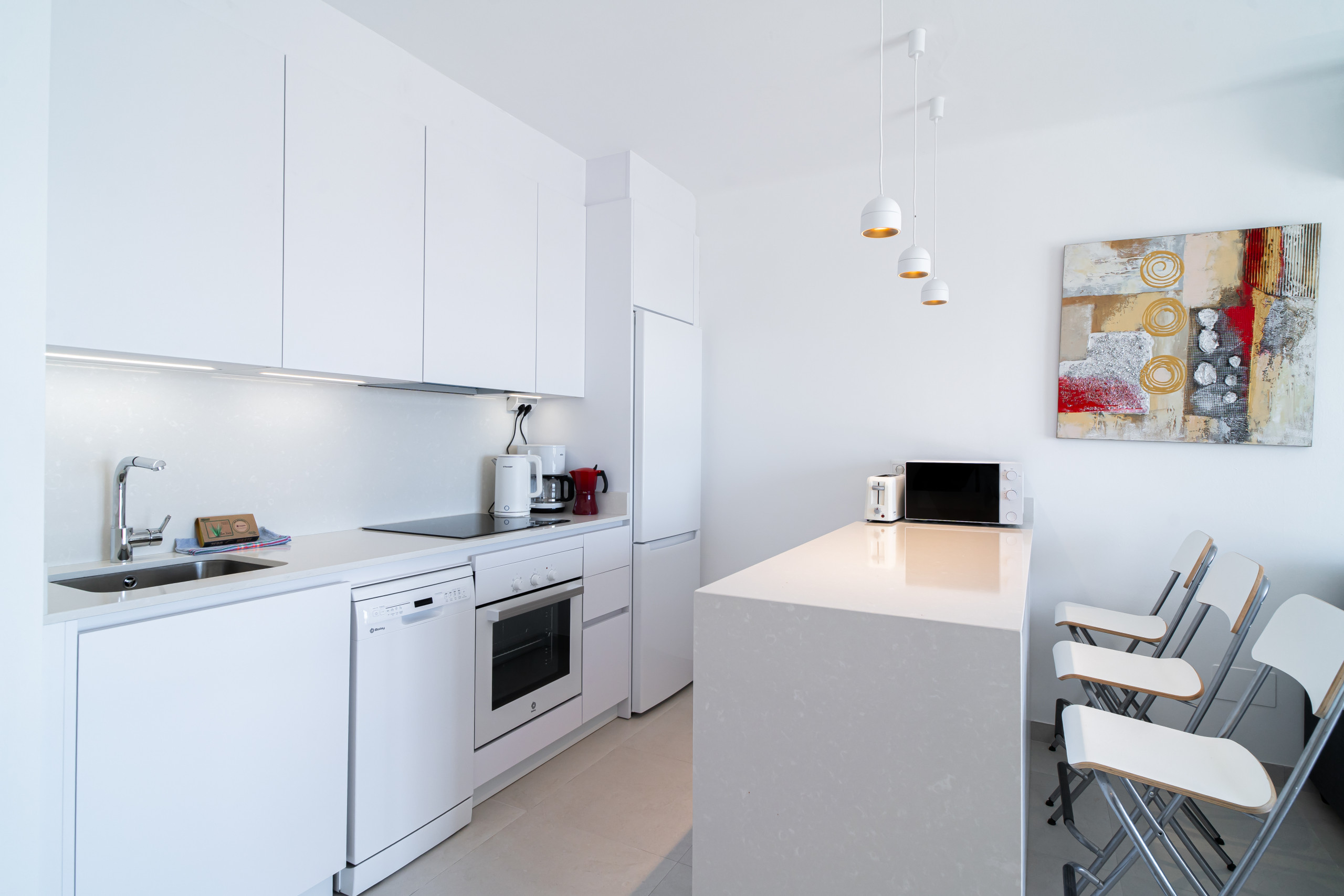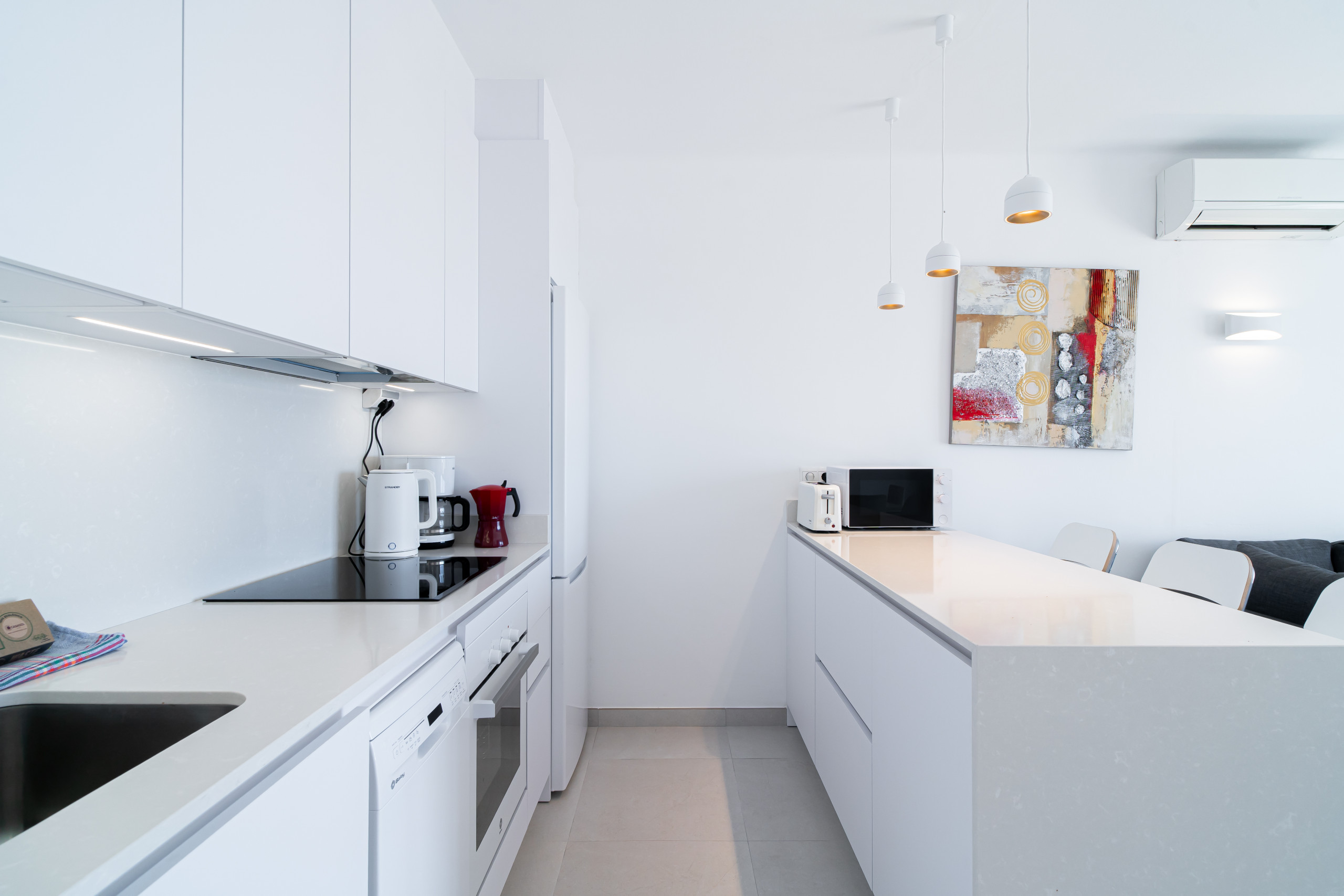 La cuisine moderne ouverte comprend un lave-vaisselle et tous les appareils électroménagers indispensables pour se sentir comme chez soi.
