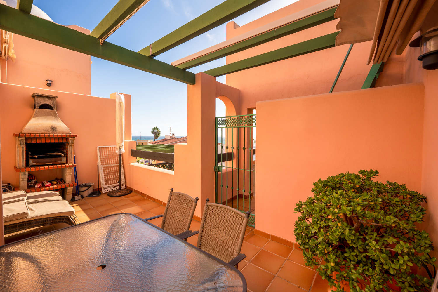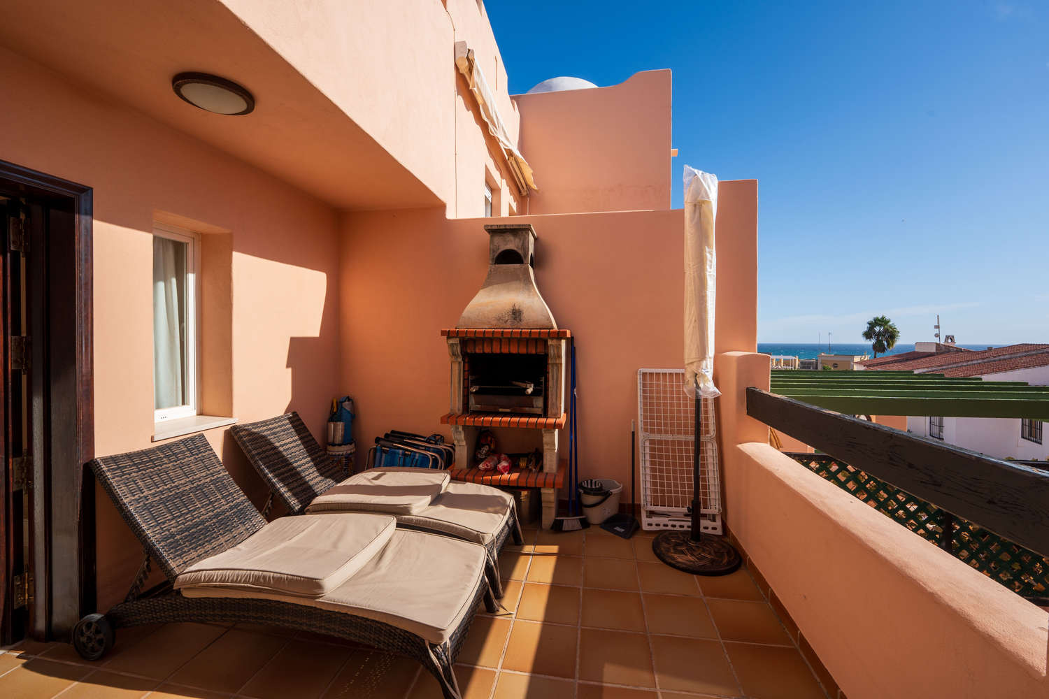 La propriété se distingue par une distribution intelligente qui sépare la zone de repos de la zone sociale par seulement huit marches. Elle dispose de deux chambres : la principale avec un lit king size et une salle de bain attenante, et une deuxième chambre avec deux lits simples, toutes deux équipées de matelas de haute qualité pour garantir un repos optimal. La cuisine indépendante est spacieuse et entièrement équipée pour les longs séjours, complétée par une salle de bain principale avec baignoire. La climatisation centralisée dans tout le logement assure une température parfaite pour dormir facilement, même pendant les journées les plus chaudes.Terrasses privées avec barbecue et lumière naturelle