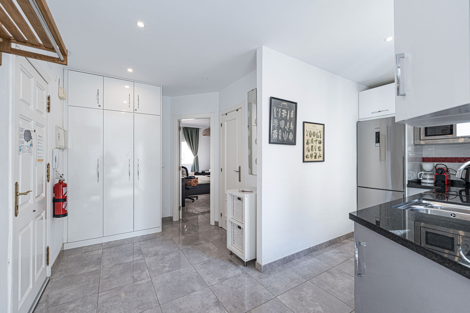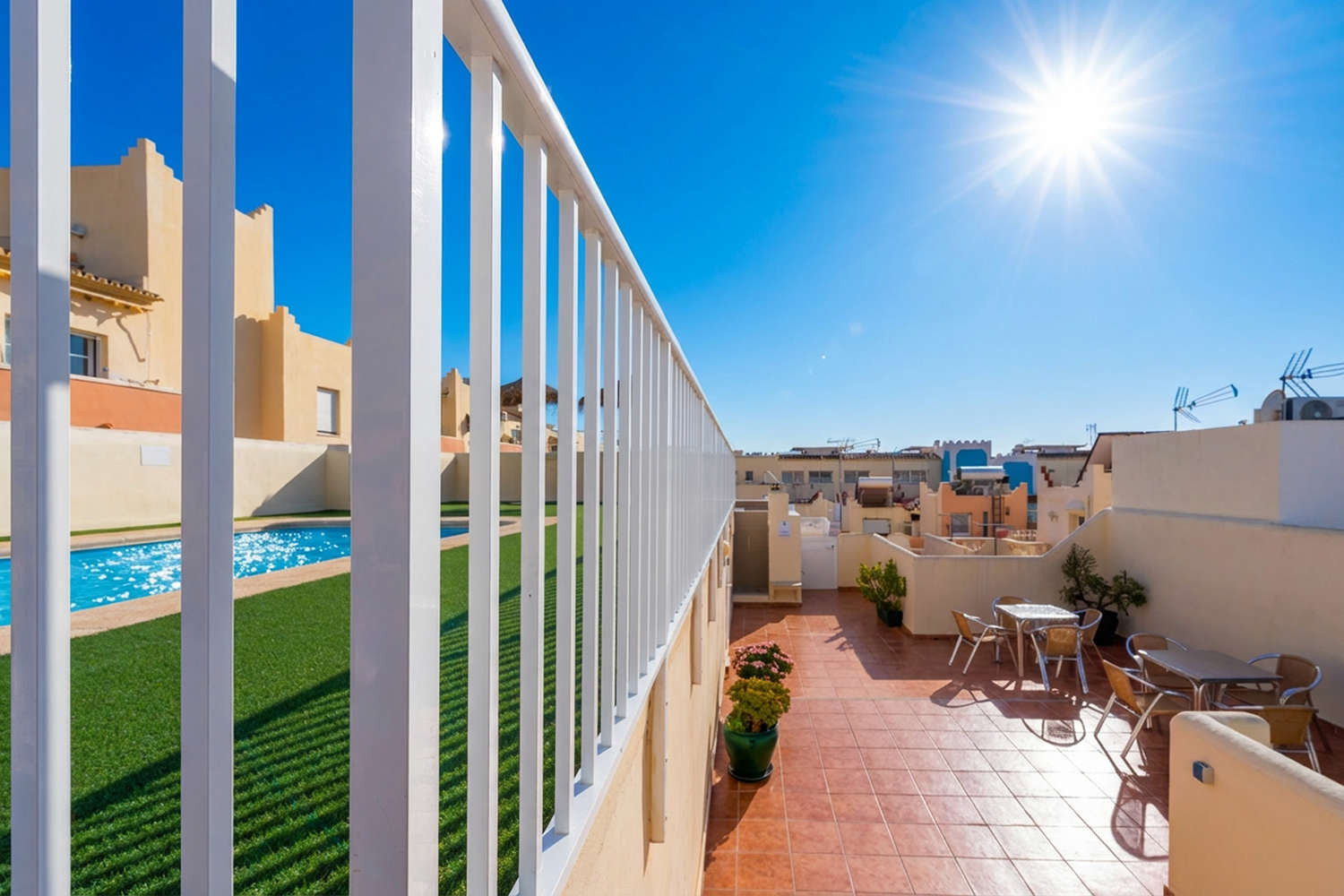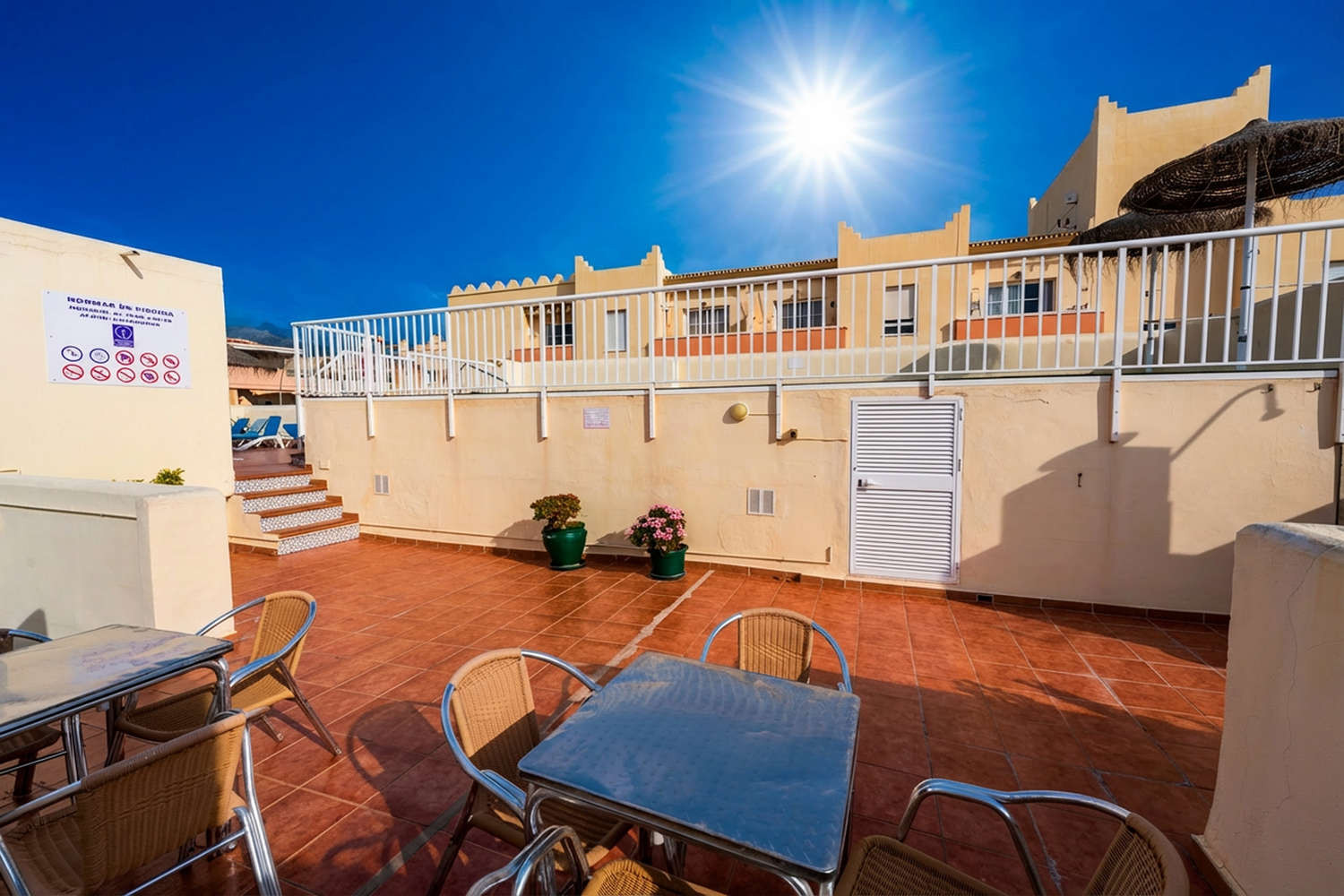 L'intérieur a été rénové pour offrir une ambiance ordonnée et technologique. Dans le salon, vous disposerez d'une TV avec 190 chaînes internationales, tandis que la chambre principale, avec son grand lit double, cache un détail très apprécié : un bureau privé avec lampe. Grâce au Wi-Fi par fibre haut débit, ce coin est parfait pour gérer des tâches rapides ou pour des séjours de moyenne durée, alliant repos et connectivité totale.Urbanisation andalouse avec piscine sur le toit