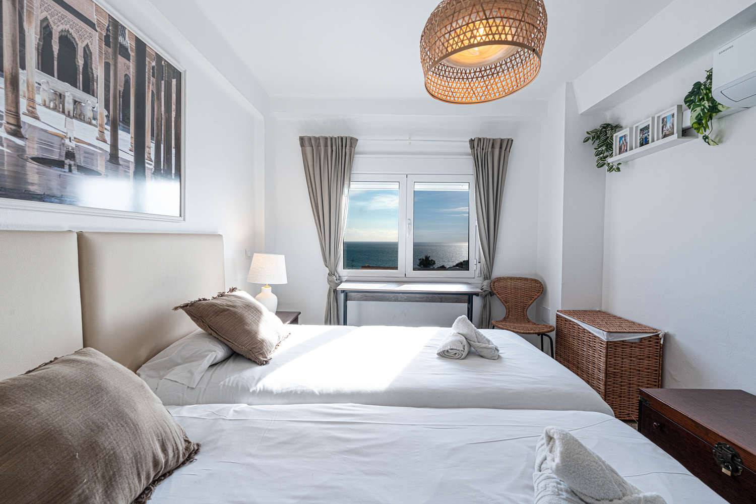 ⹠Chambre principale avec deux lits de 90 cm rapprochés, avec vue sur la mer, offrant une atmosphÚre lumineuse et relaxante.