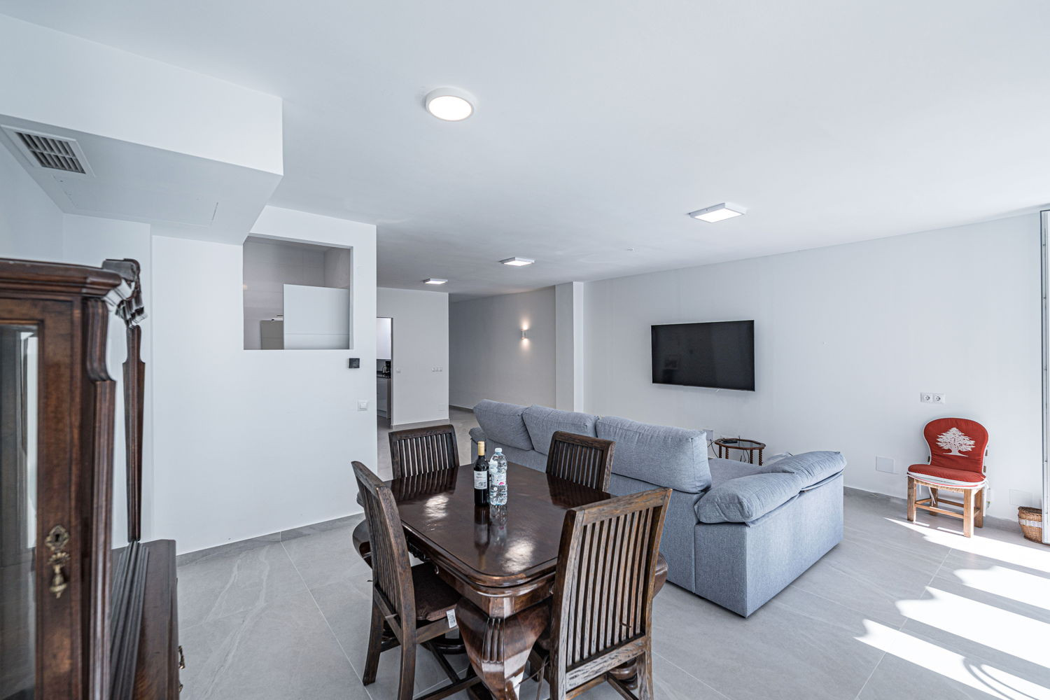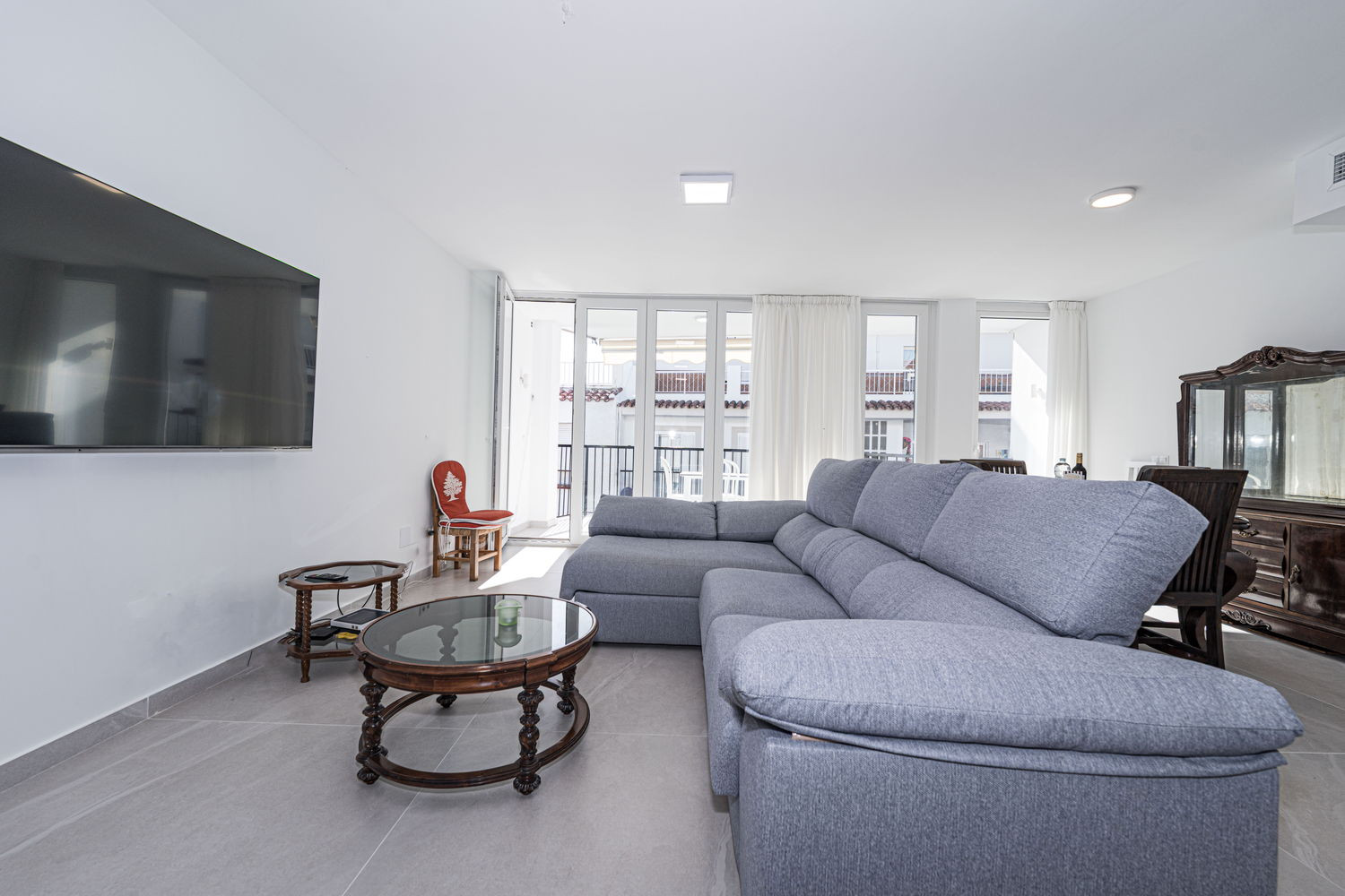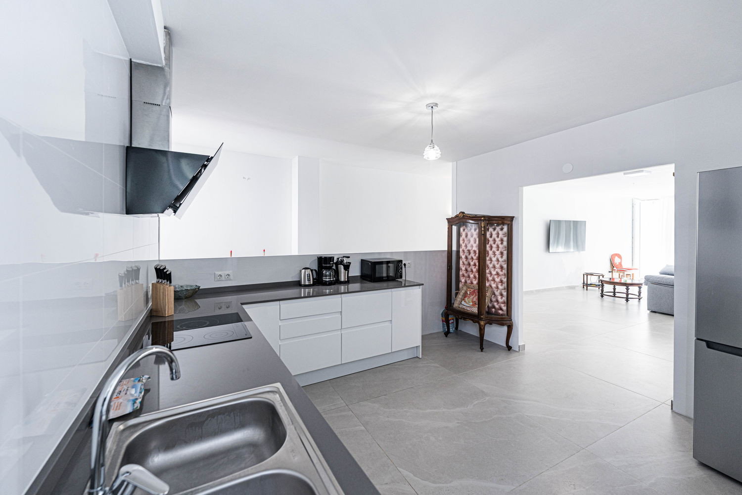 Vie intérieure et extérieure : Le cœur de la maison est un salon exceptionnellement spacieux et lumineux, directement relié à la terrasse extérieure donnant sur la rue principale. Cette fluidité permet à la brise du centre-ville de rafraîchir toute la pièce. La cuisine est équipée d'appareils électroménagers haut de gamme et dispose de tout le nécessaire pour votre séjour, y compris un lave-vaisselle, un four et un micro-ondes. C'est un espace fonctionnel et moderne, idéal pour préparer un café rapide avant d'aller à la plage ou un dîner complet en famille.