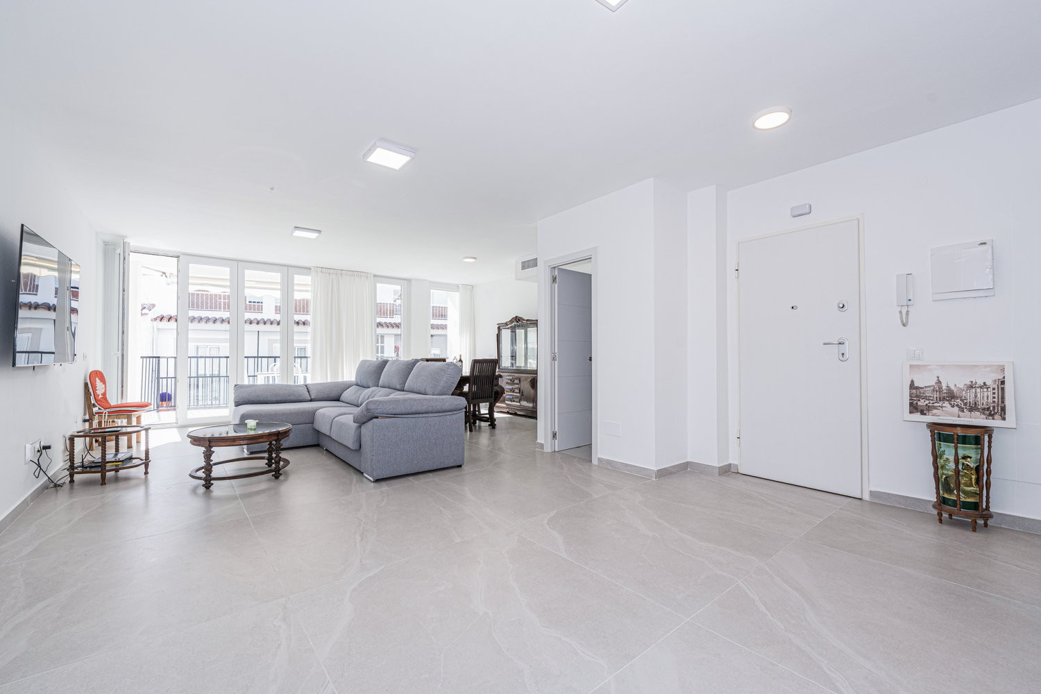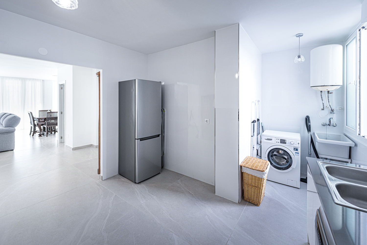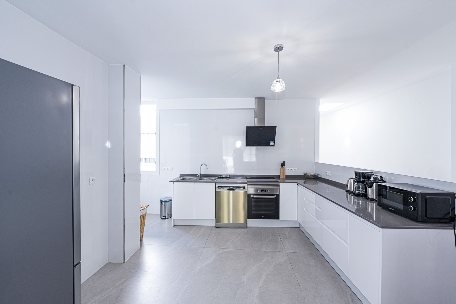 Vie intérieure et extérieure : Le cœur de la maison est un salon exceptionnellement spacieux et lumineux, directement relié à la terrasse extérieure donnant sur la rue principale. Cette fluidité permet à la brise du centre-ville de rafraîchir toute la pièce. La cuisine est équipée d'appareils électroménagers haut de gamme et dispose de tout le nécessaire pour votre séjour, y compris un lave-vaisselle, un four et un micro-ondes. C'est un espace fonctionnel et moderne, idéal pour préparer un café rapide avant d'aller à la plage ou un dîner complet en famille.