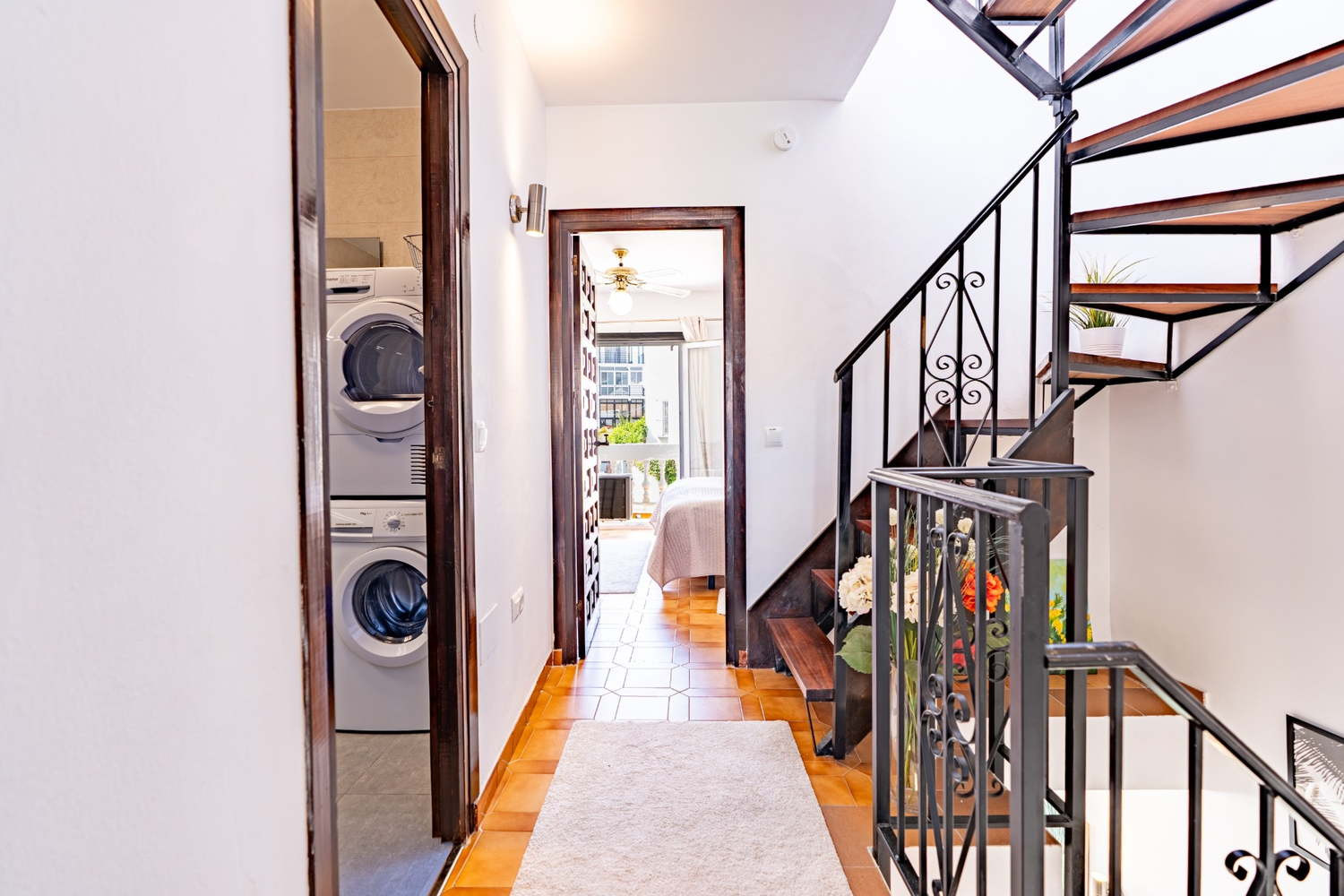 Cette maison mitoyenne située dans la résidence La Hacienda est l'une des options les plus complètes pour une location de vacances à Nerja. Depuis sa position privilégiée dans le quartier du Parador, vous profiterez d'une vue sur la Méditerranée et du confort d'être à seulement 350 m de la plage de Burriana. La propriété dispose d'une décoration soignée respectant le style andalou, offrant le calme au bord de l'eau sans renoncer aux services du centre de Nerja.Distribution et capacité pour 6 personnes