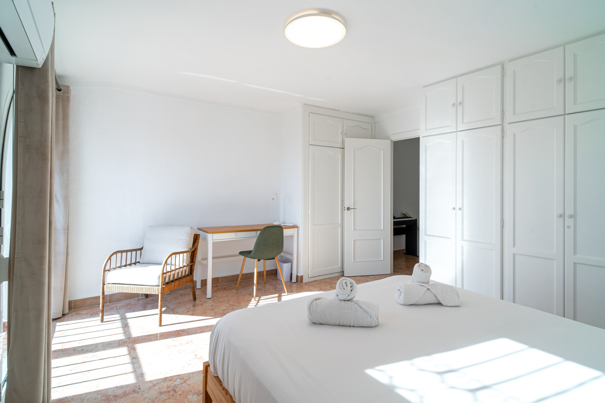 ✨ Chambre principale avec lit queen size (160x200), armoire encastrée, bureau et vue sur la mer.