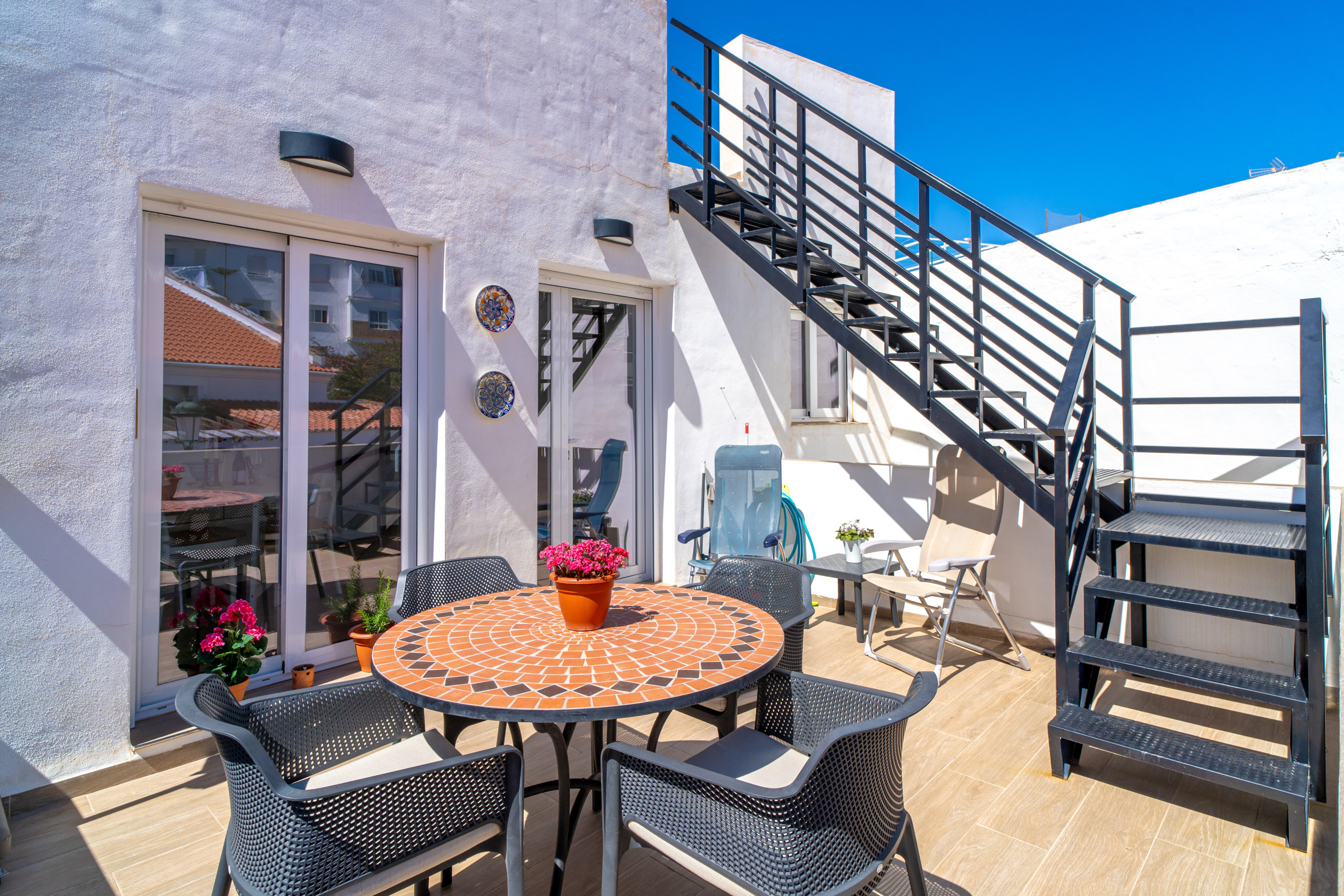 • Première terrasse avec table, chaises et parasol, idéale pour prendre le petit-déjeuner au soleil ou dîner en plein air.