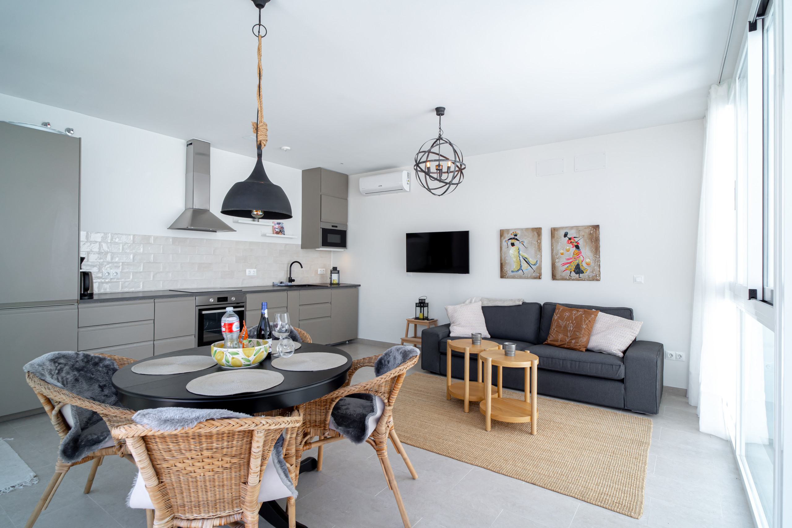 ✔ Salon avec cuisine ouverte et porte vitrée donnant sur la terrasse