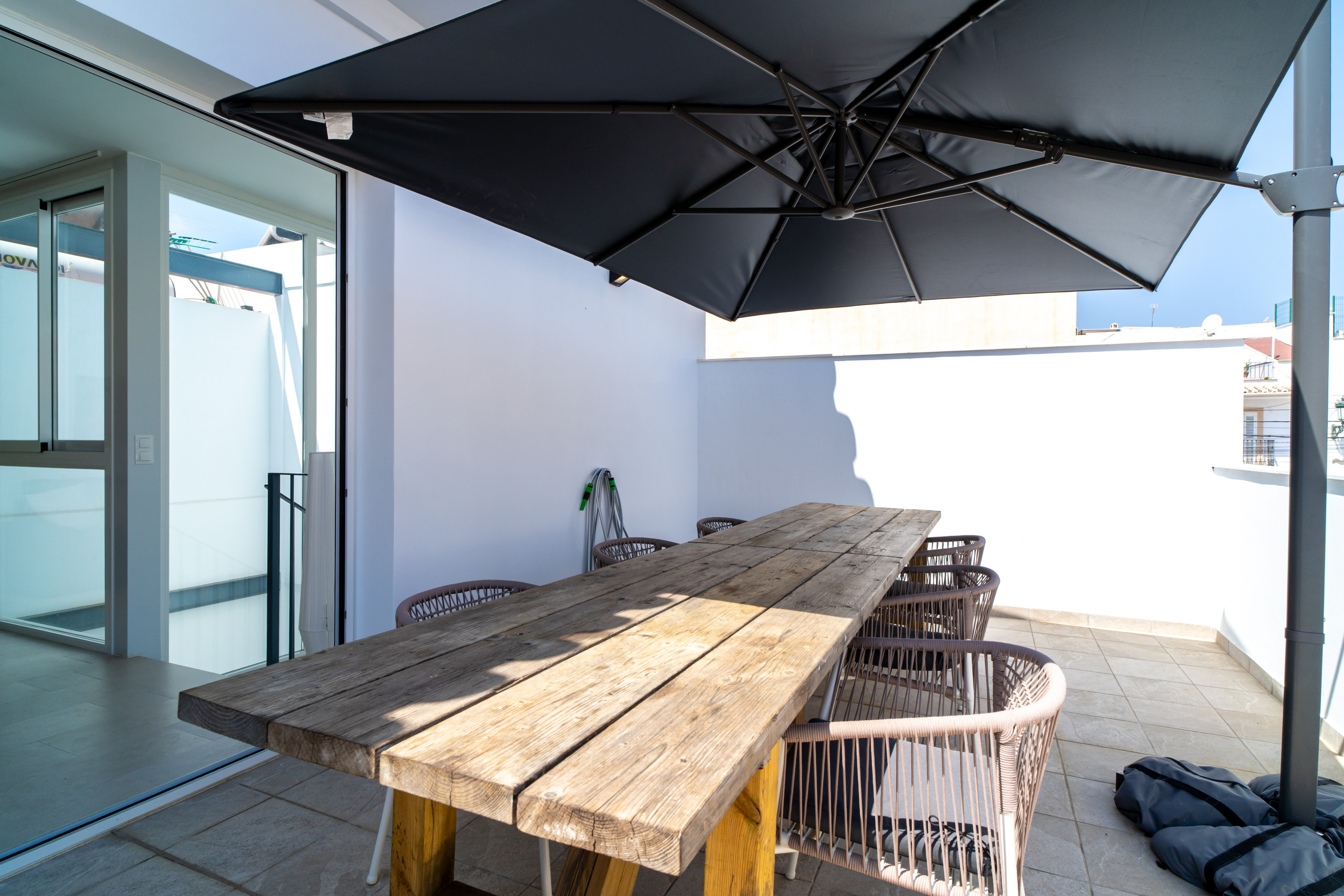 • Première terrasse (30 m²) avec table à manger d'extérieur, parfaite pour prendre vos repas en plein air en famille ou entre amis